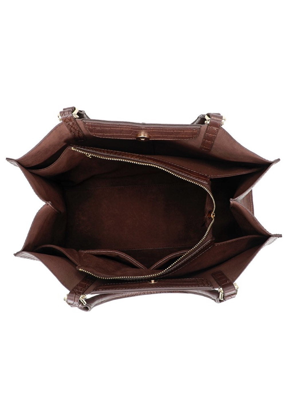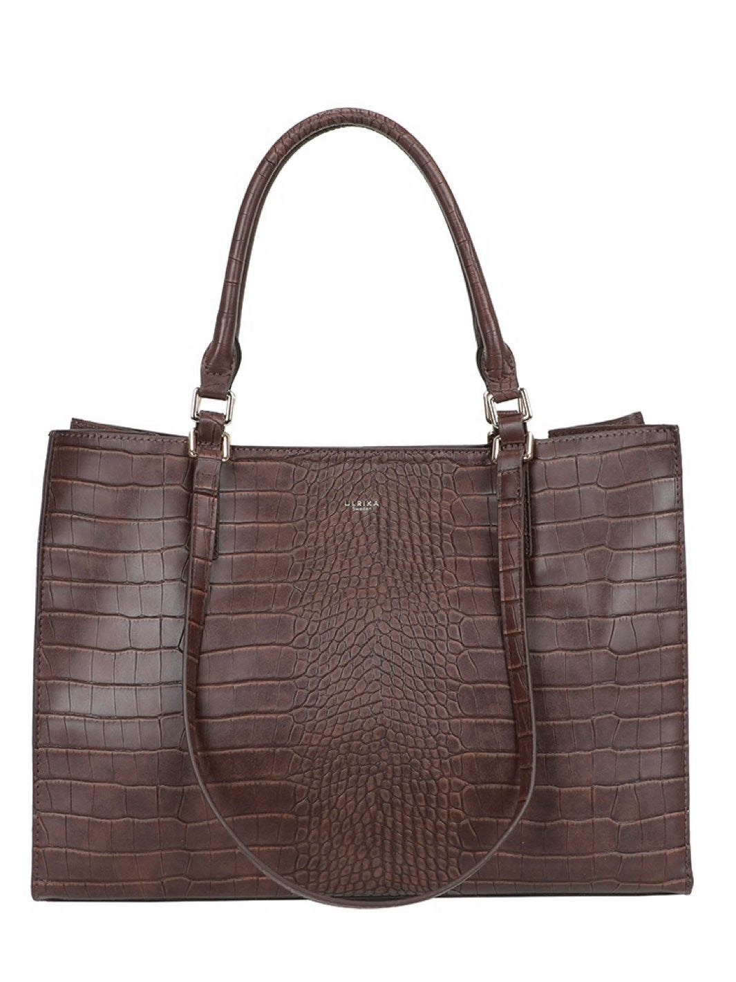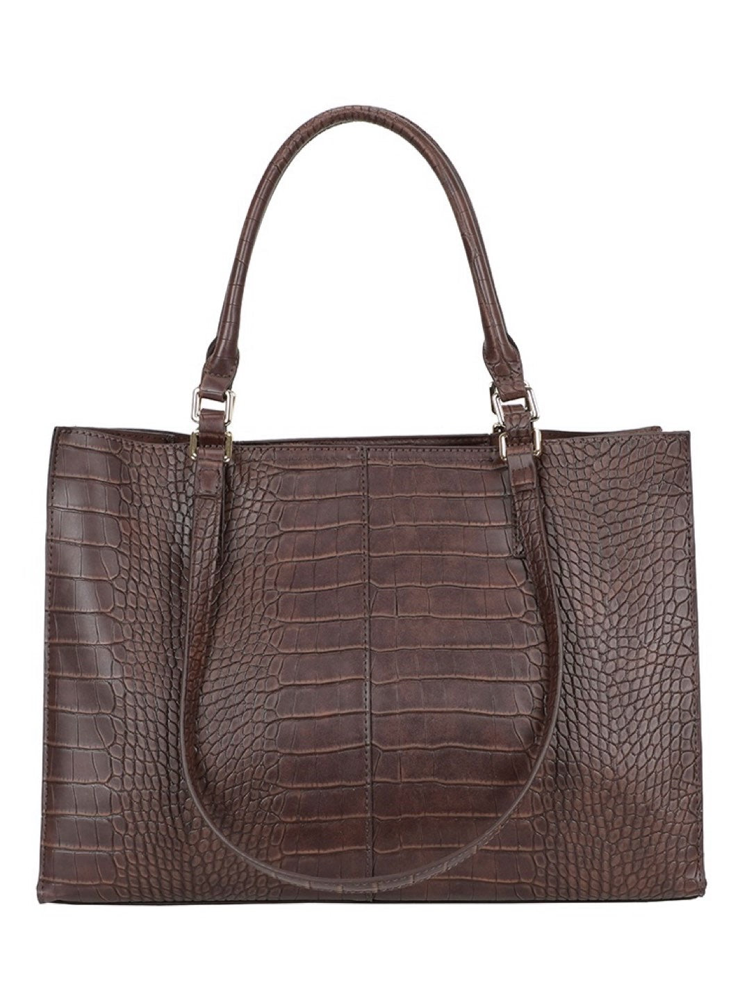 Stor veske i imitert skinn som passer godt til hverdag og fest. Vesken har to side rom og et stor hoved rom med glidelås. I hovedrommet har du flere ulike sorterings alternativ, både med og uten glidelås. Vesken lukkes på toppen med en knapp, og har både en lang og kort hånd hempe.
