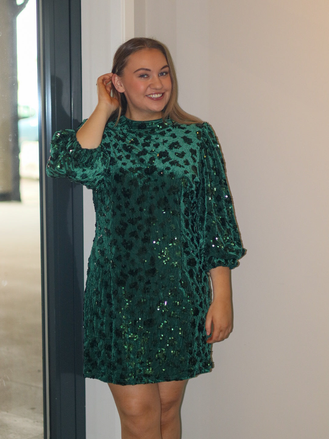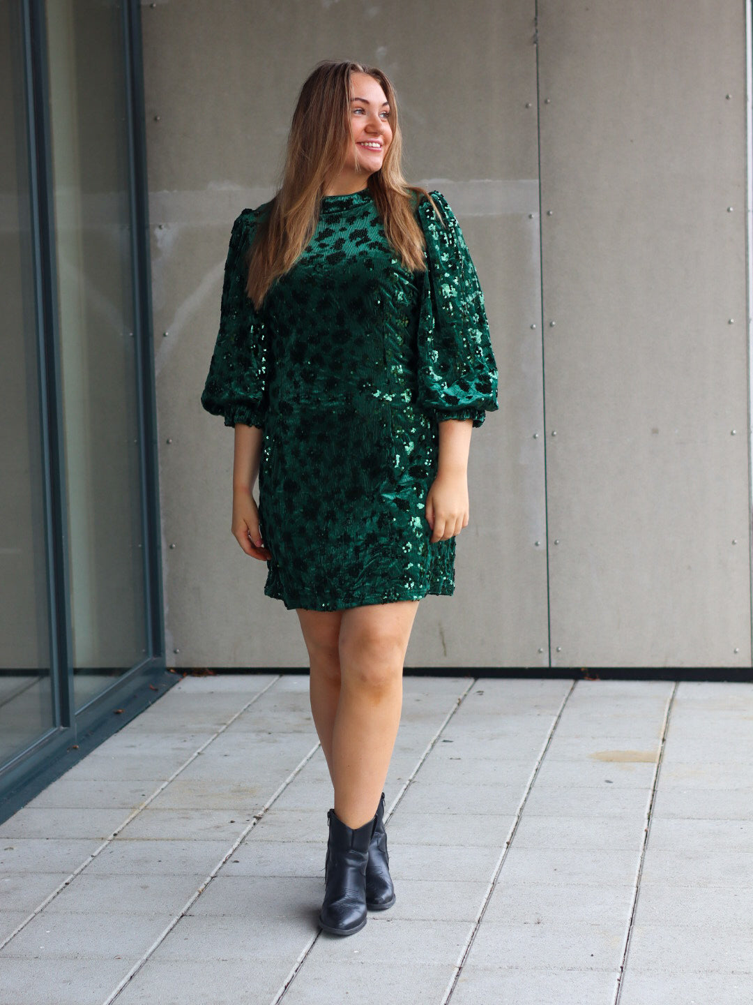 Lekker kjole med en rett passform, 3/4 korte puffermer og høy hals.