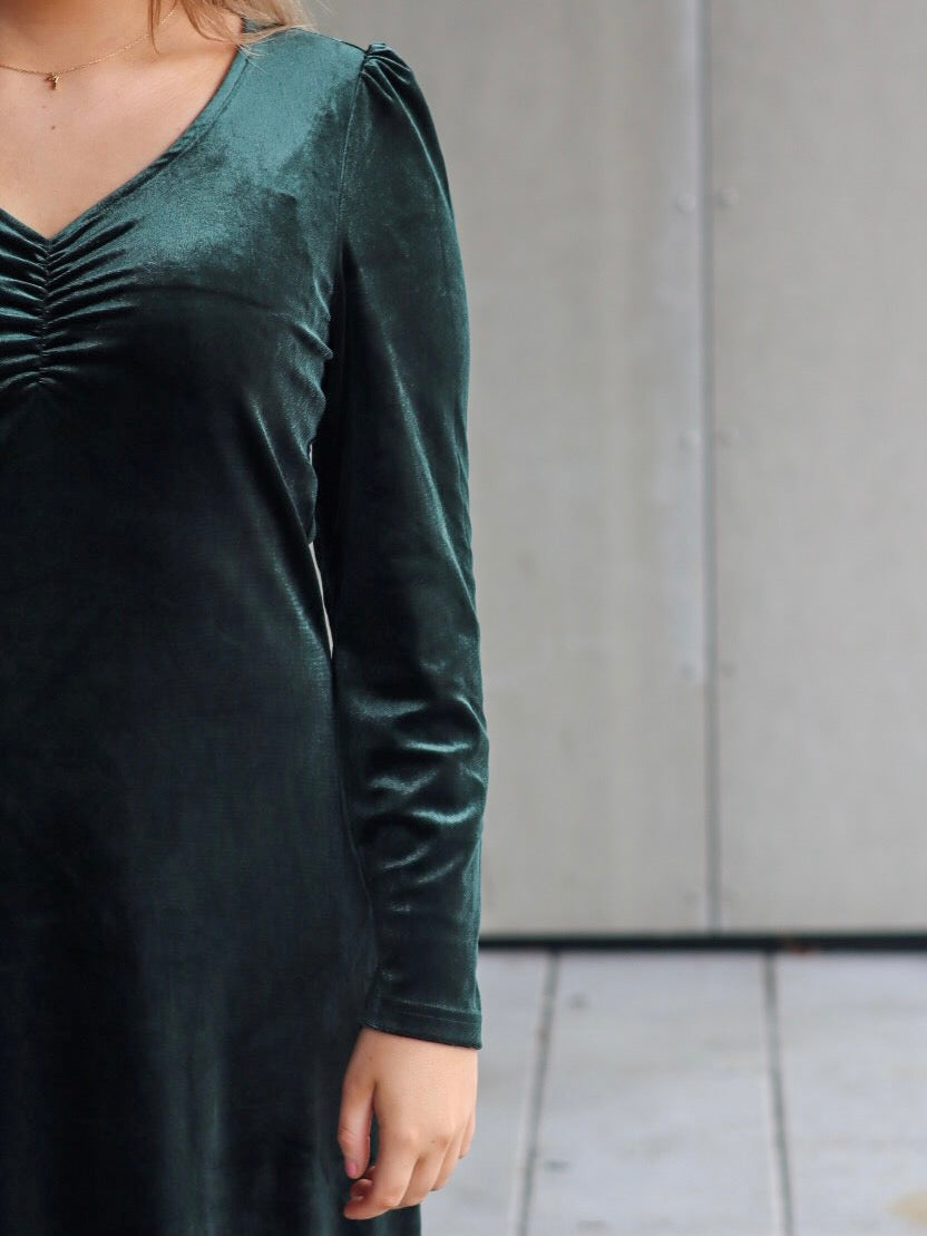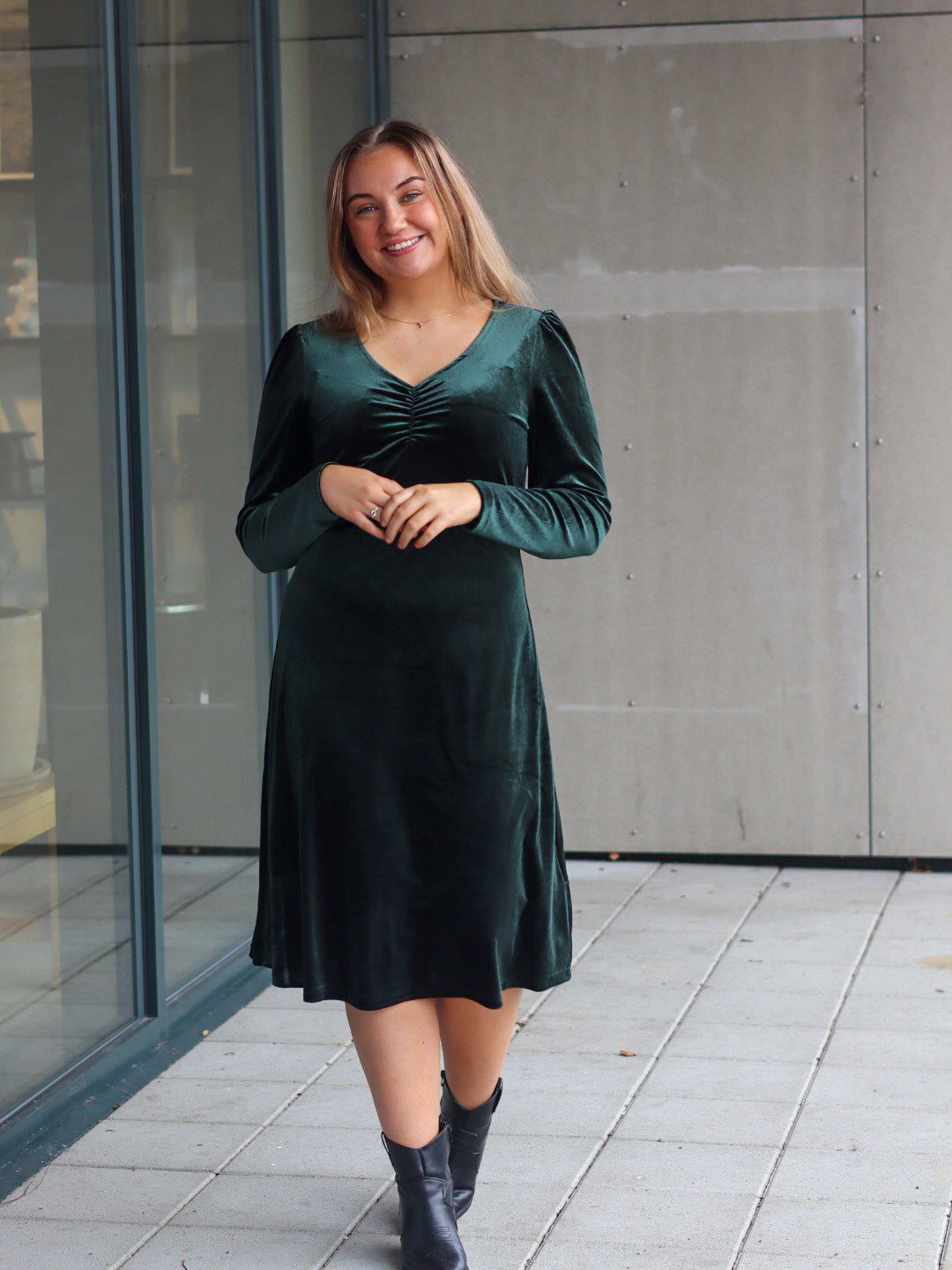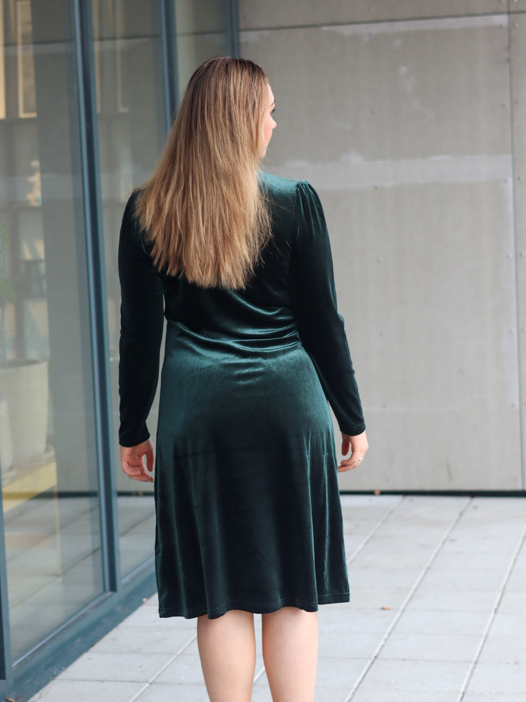 Lekker velourkjole med v-hals, draperinger over brystet og lange ermer. Kjolen har en a-fasong.