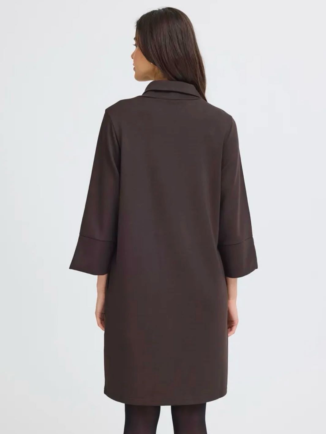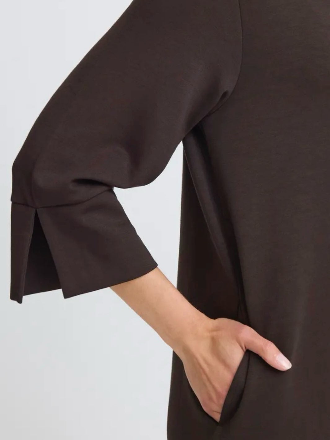 Myk og herlig kjole med høy hals, 3/4 korte ermer og en avslappet passform. Kjolen har to lommer foran!