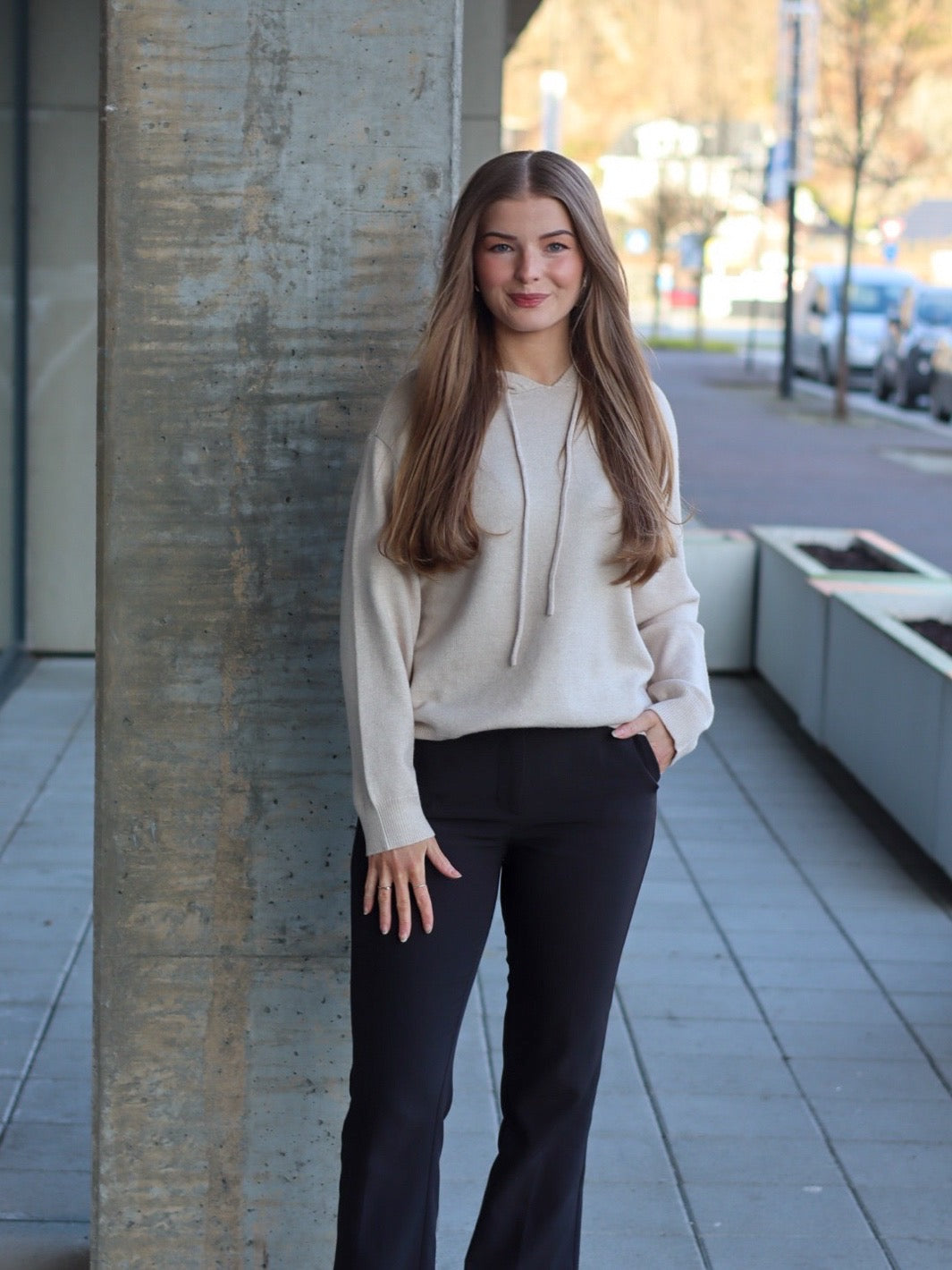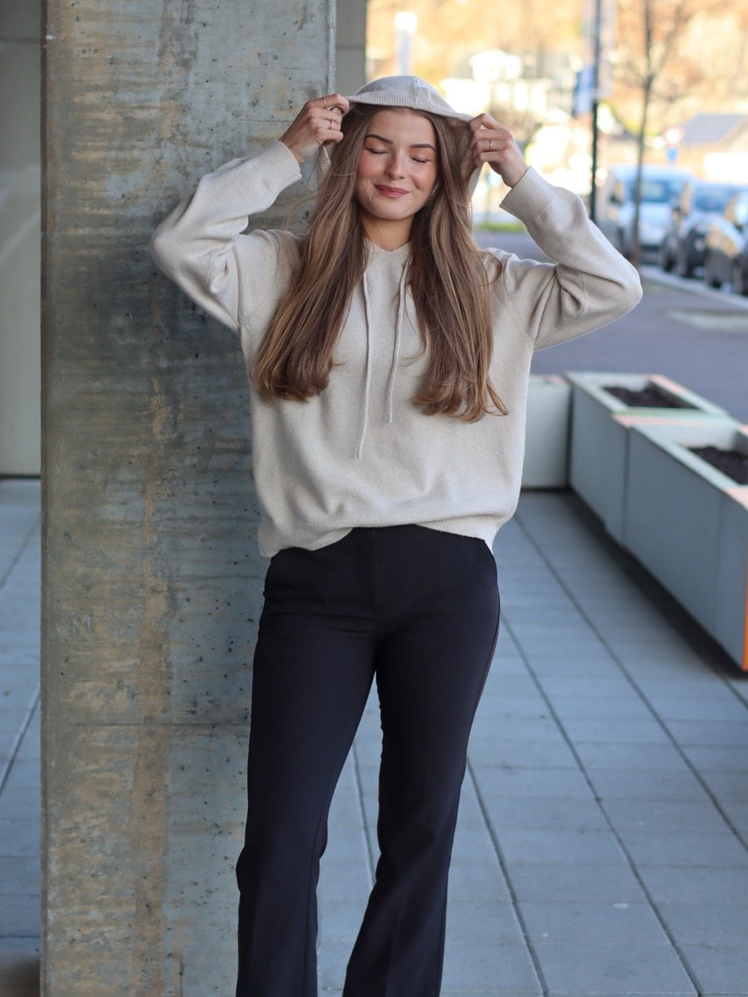 Myk viskose genser med hette, lange ermer og snøring i halsen. Genseren har en avslappet passform.