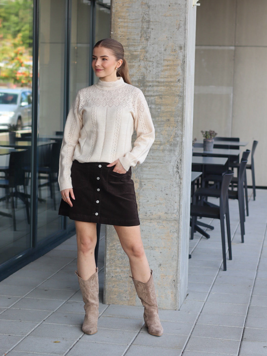 Nydelig strikkegenser med høy hals, lange ermer og en rett passform. Genseren har knapper bak og lekre detaljer.