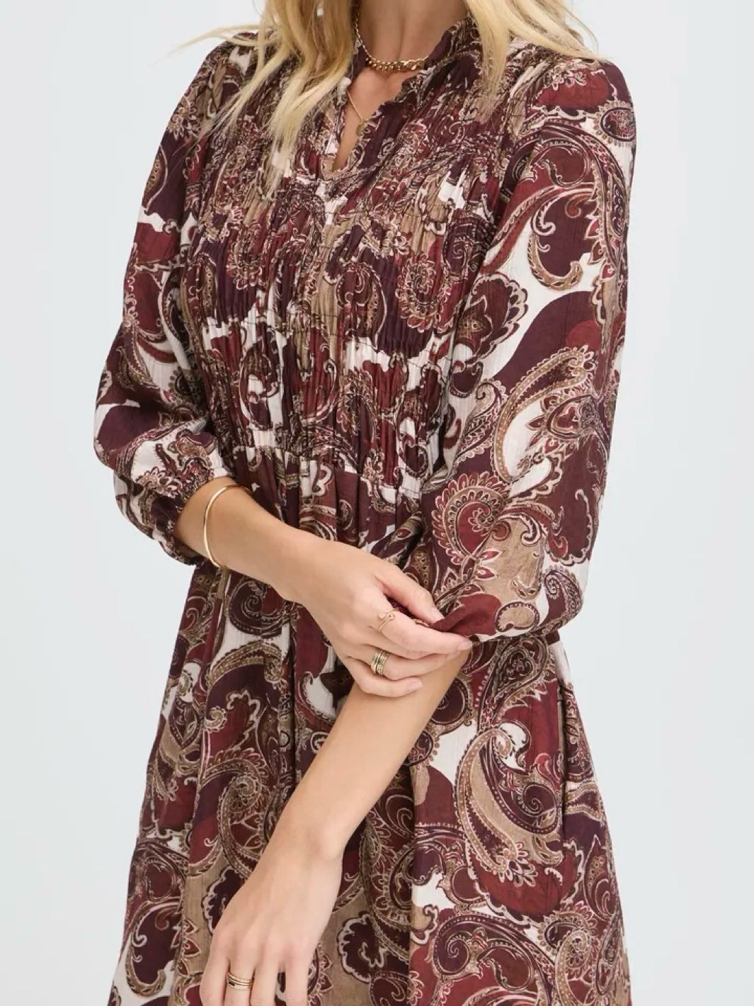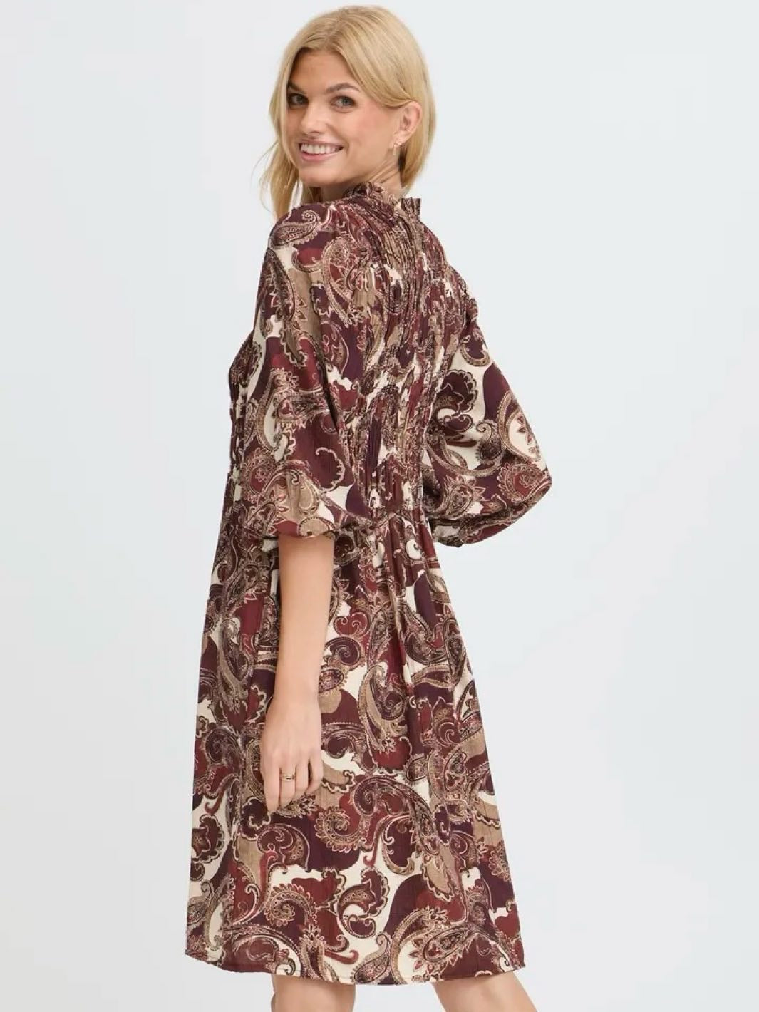 Viskose kjole med v-hals, 3/4 korte puffermer og et heldekkende mønster. Kjolen har strikk over brystet som gir en lekker passform.