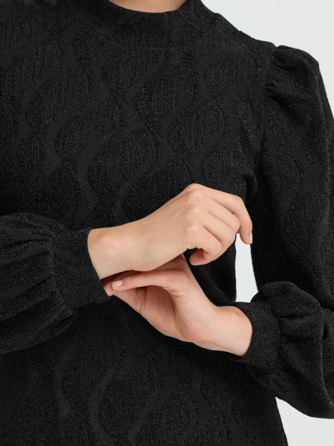 Myk og stretchy bluse med høy hals, lange ermer og en avslappet passform. Blusen har sort glitter.