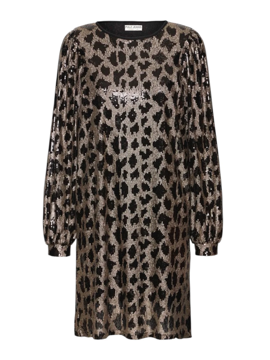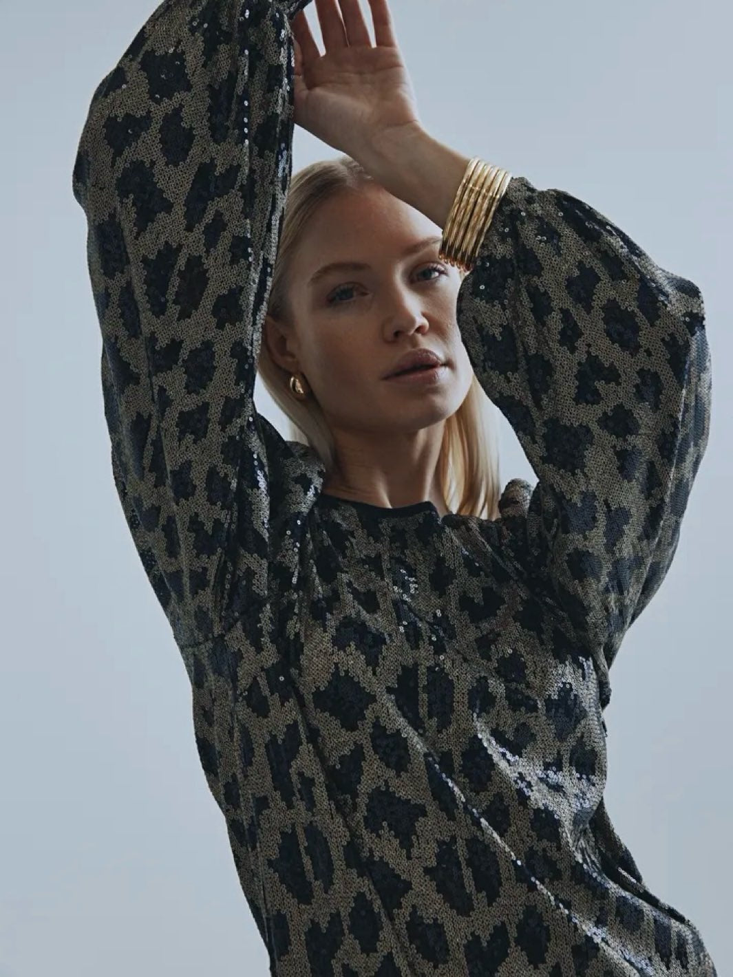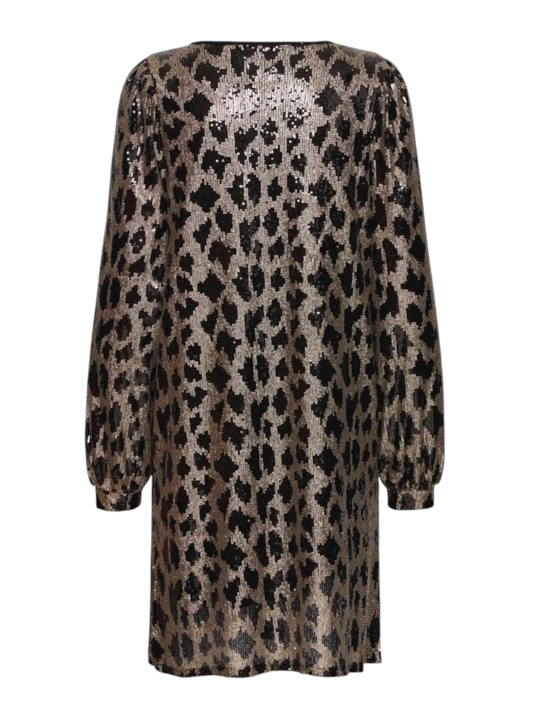 Lekker paljettkjole med rund hals, lange ermer med strikk og en avslappet passform. Kjolen har et heldekkende dyreprint.