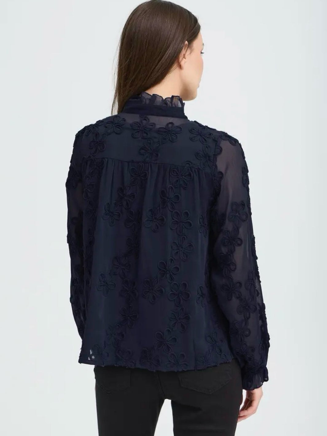 Chiffonbluse med en rett passform, høyt hals med volanger og lange ermer med strikk.
