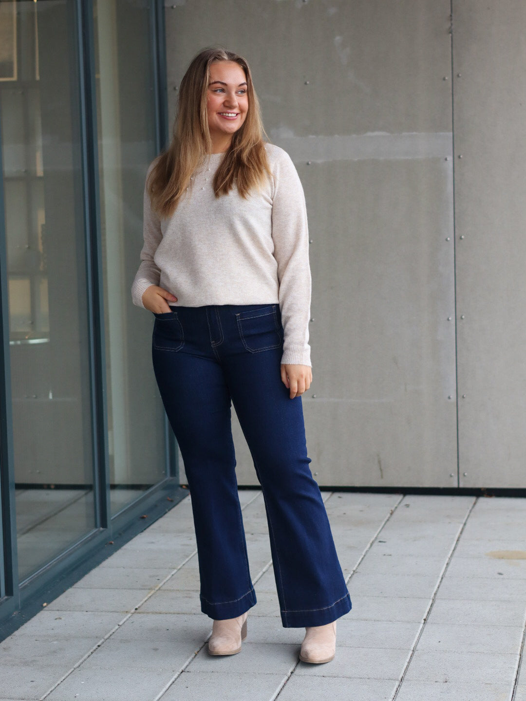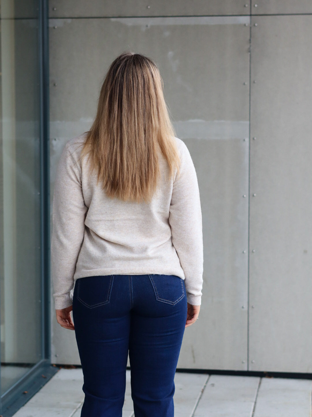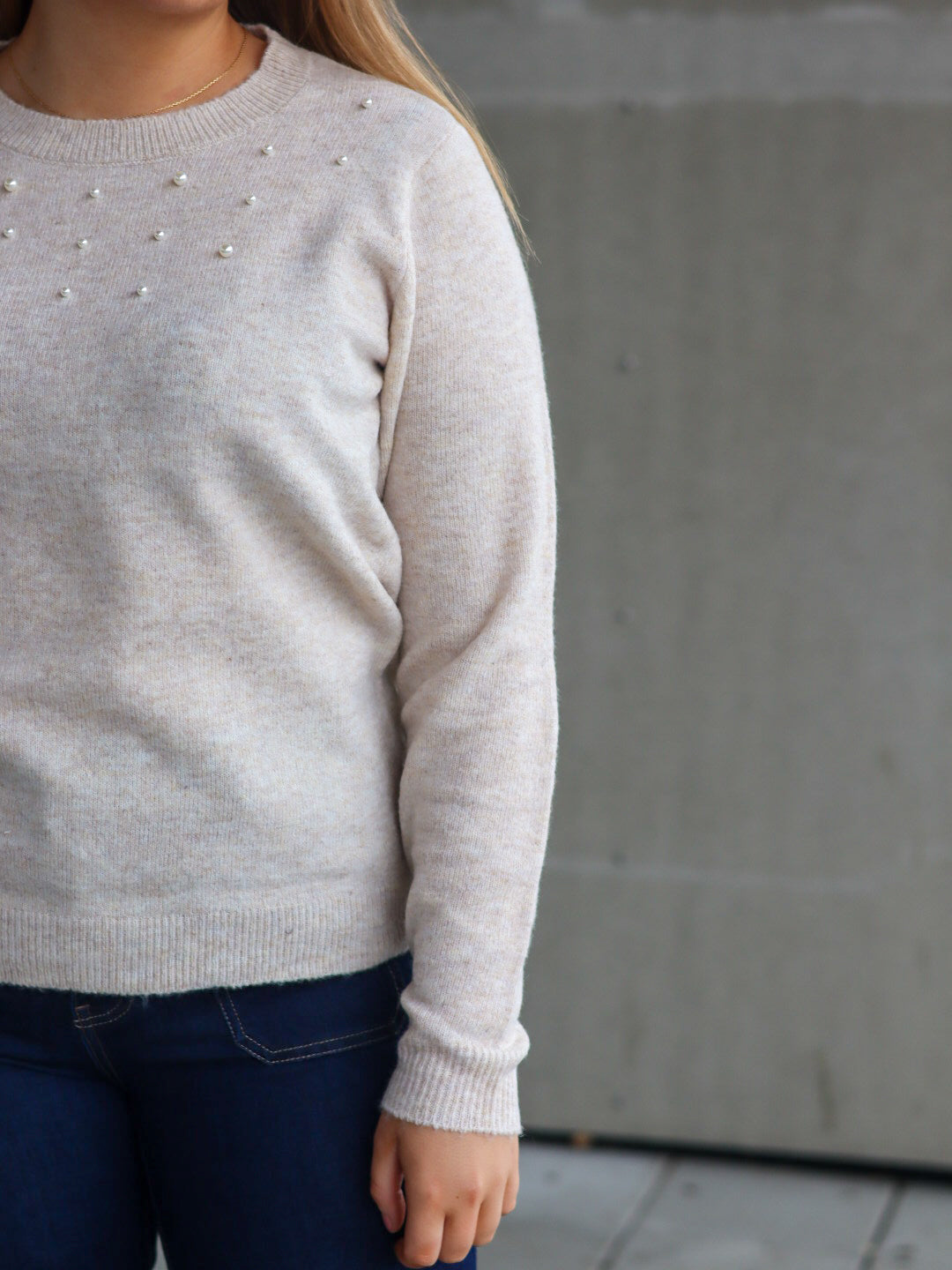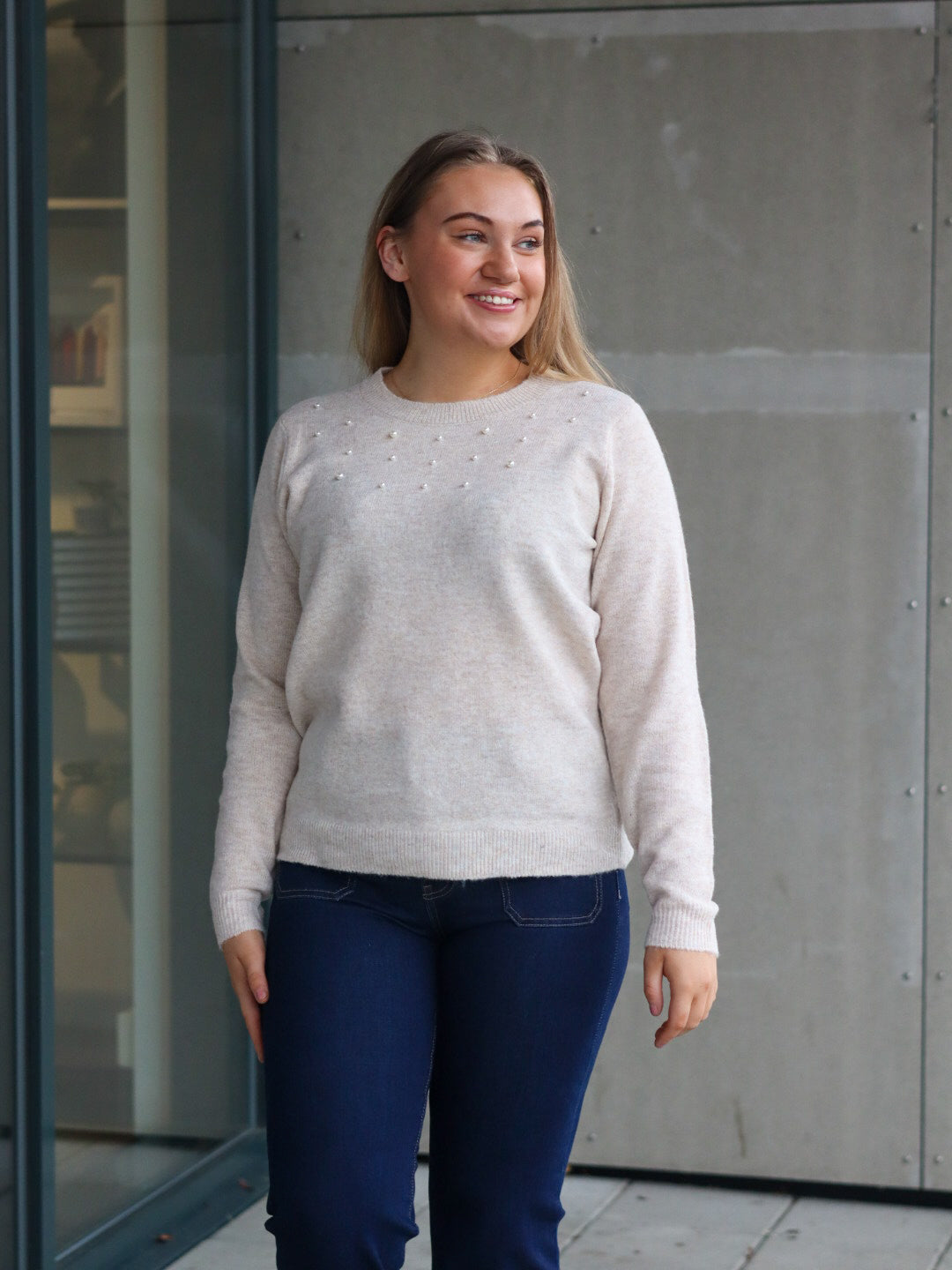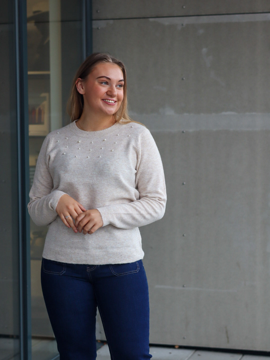 Strikkegenser med rund hals, lange ermer og en rett passform. Genseren har lekre perler på brystet