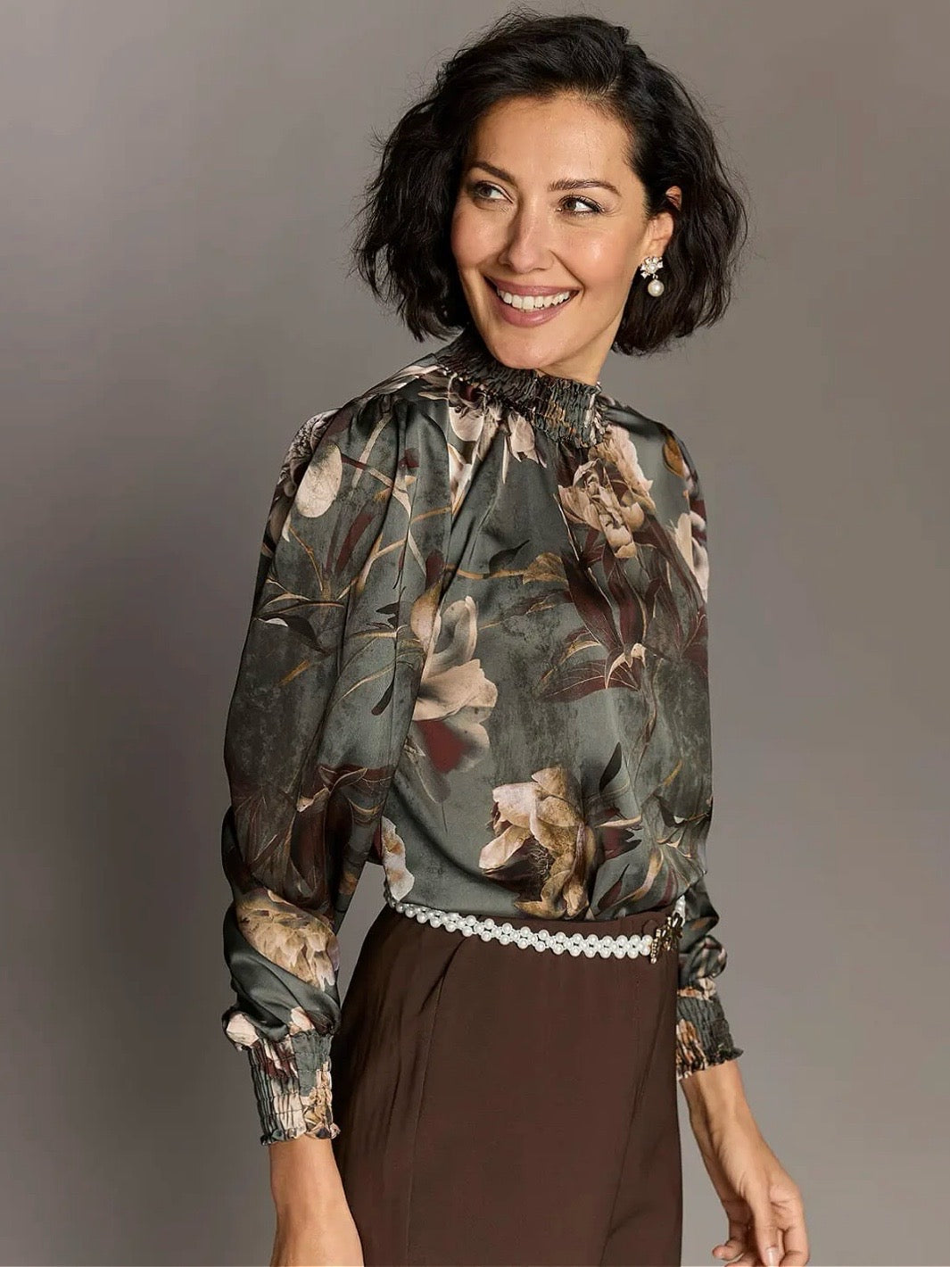En av våre mest solgte bluser i nytt print! Blusen har høy hals, lange ermer med strikk og en rett passform. Blusen har et heldekkende mønster av lekre farger.