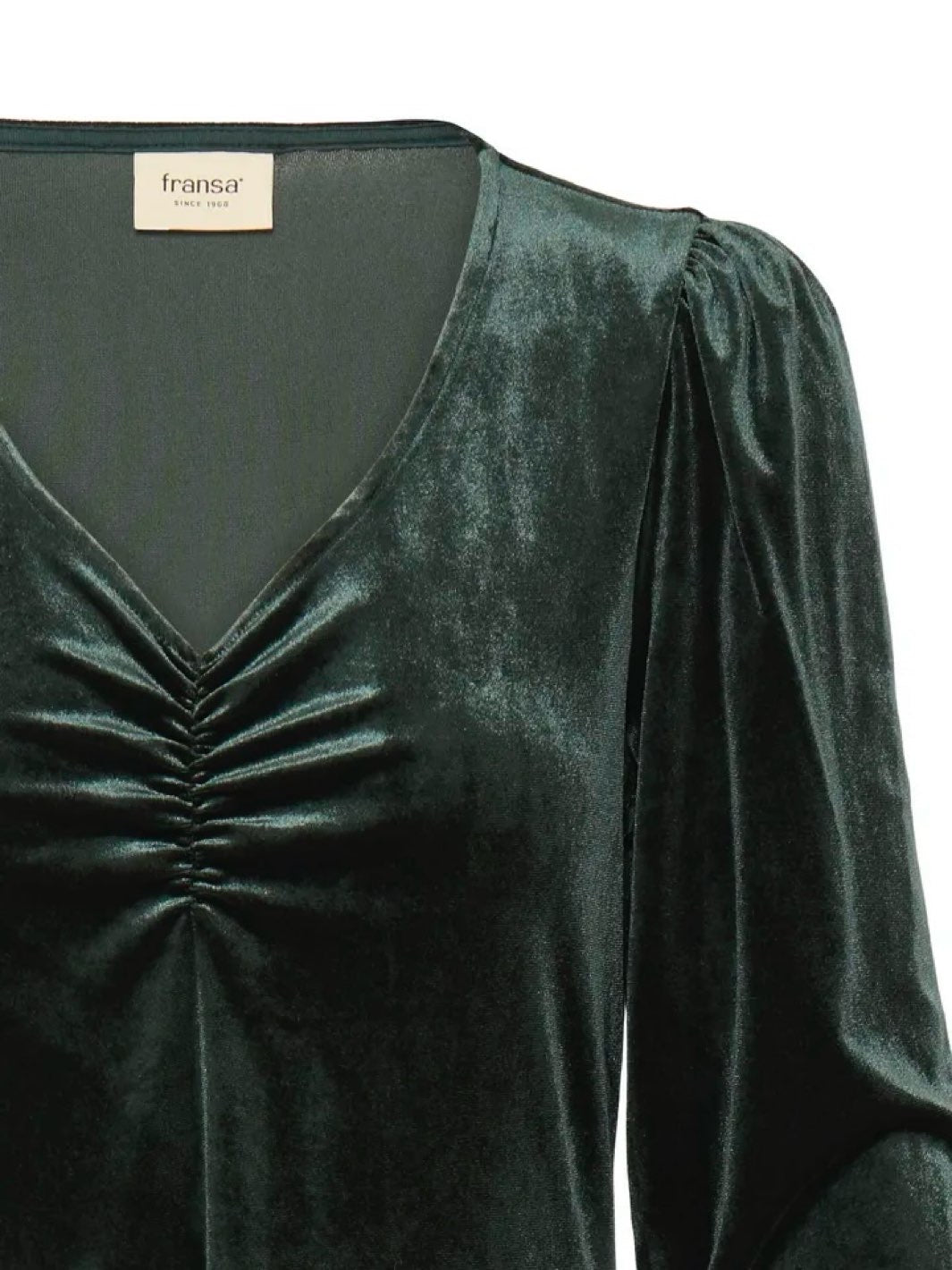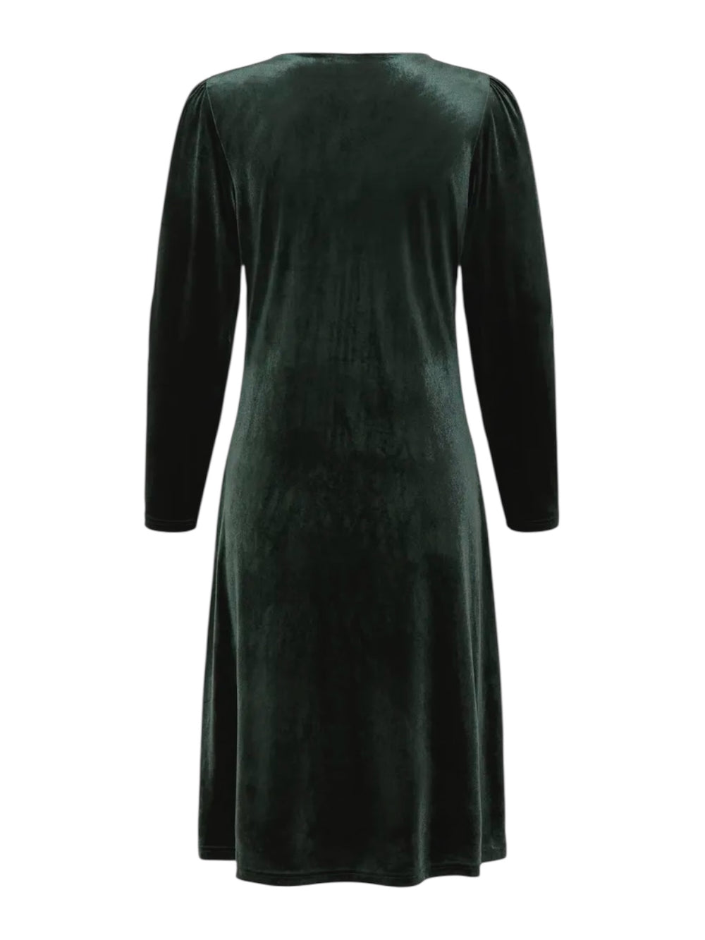 Lekker velourkjole med v-hals, draperinger over brystet og lange ermer. Kjolen har en a-fasong.