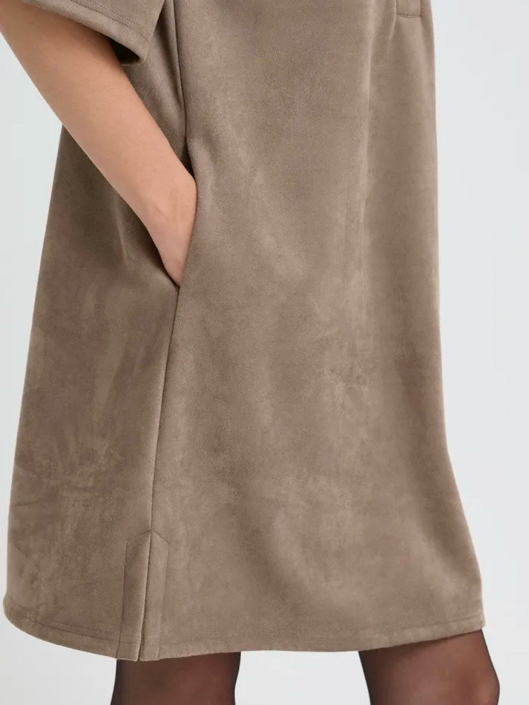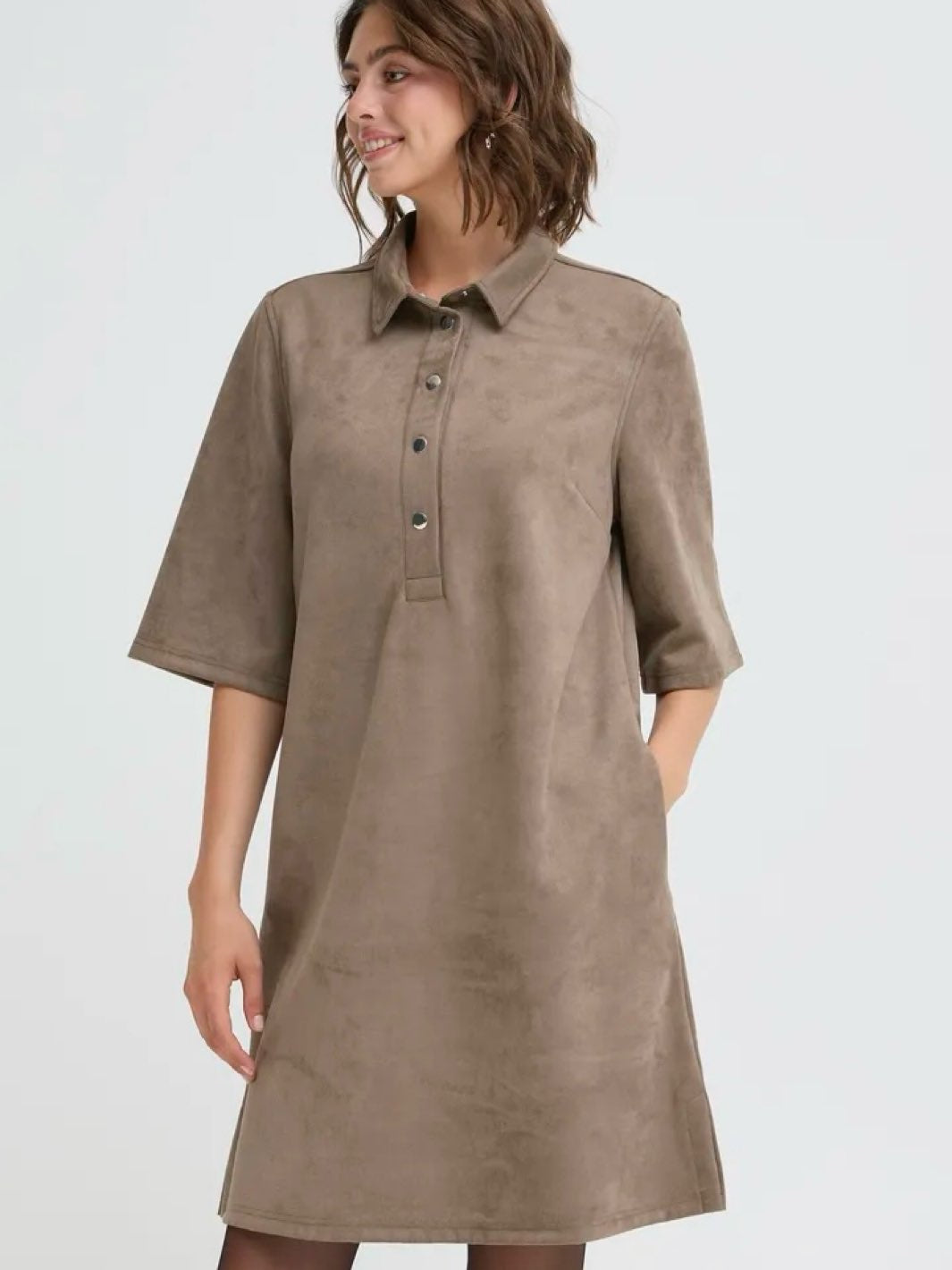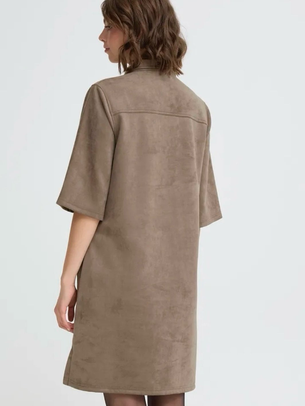 Myk og stilig kjole i imitert semsket skinn. Kjolen har korte ermer, krage og en avslappet passform. Kjolen har lommer.