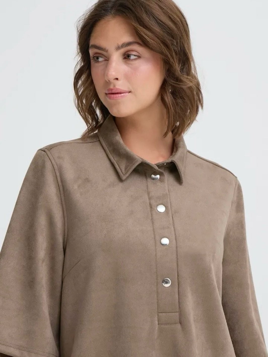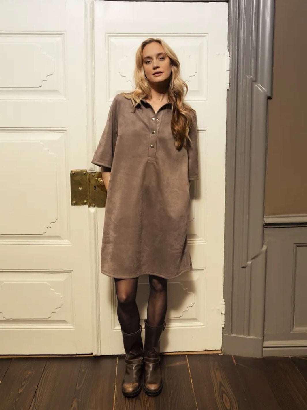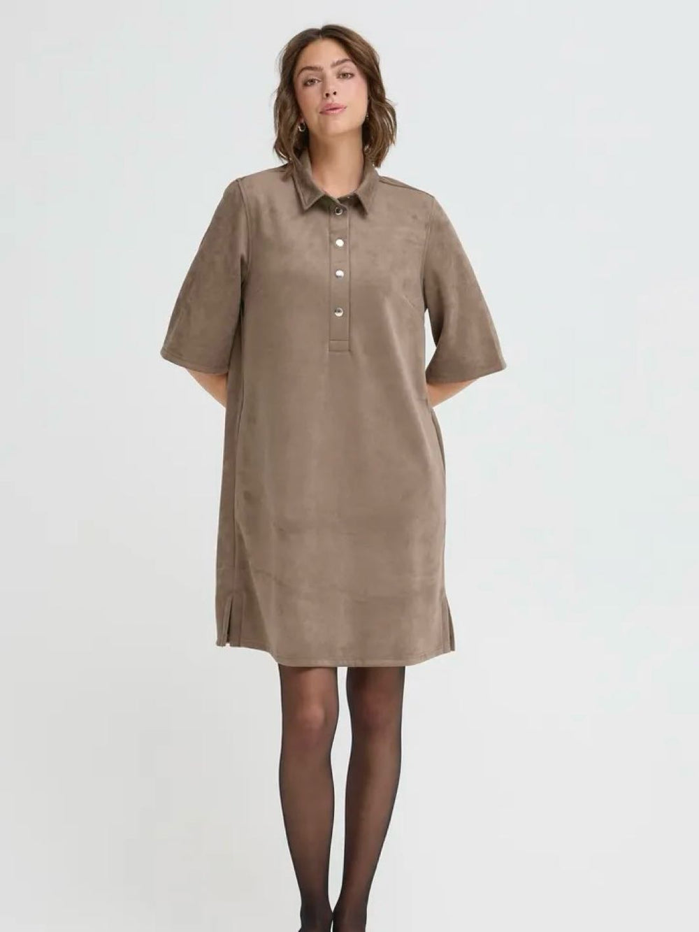 Myk og stilig kjole i imitert semsket skinn. Kjolen har korte ermer, krage og en avslappet passform. Kjolen har lommer.