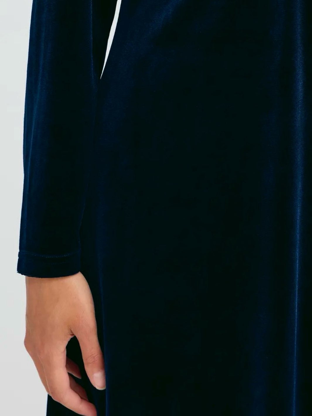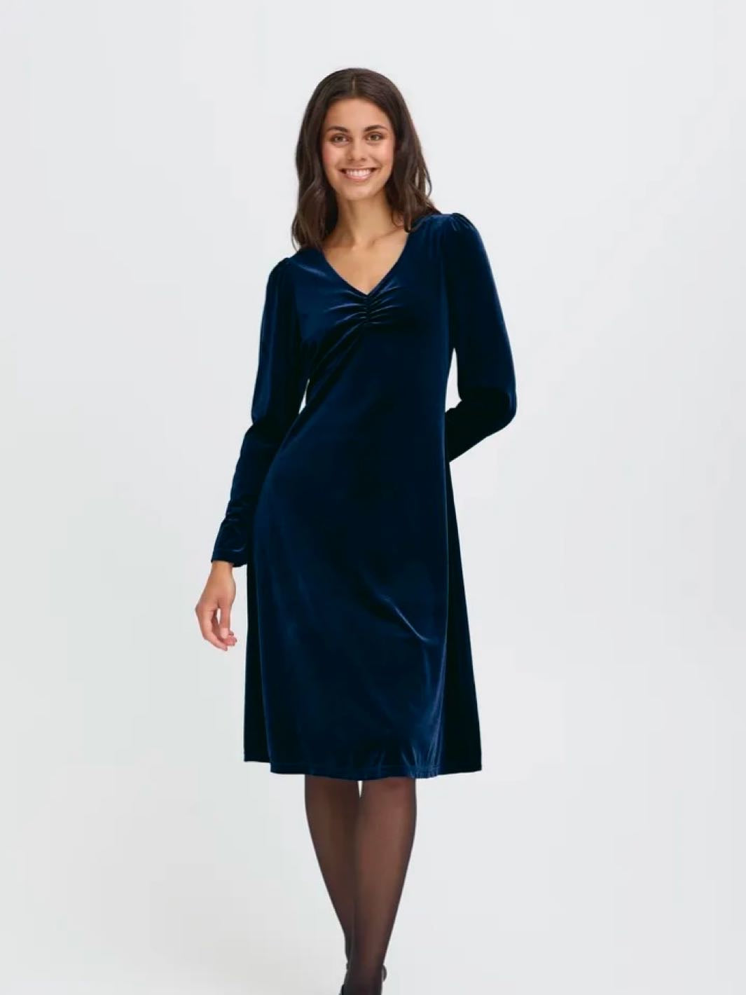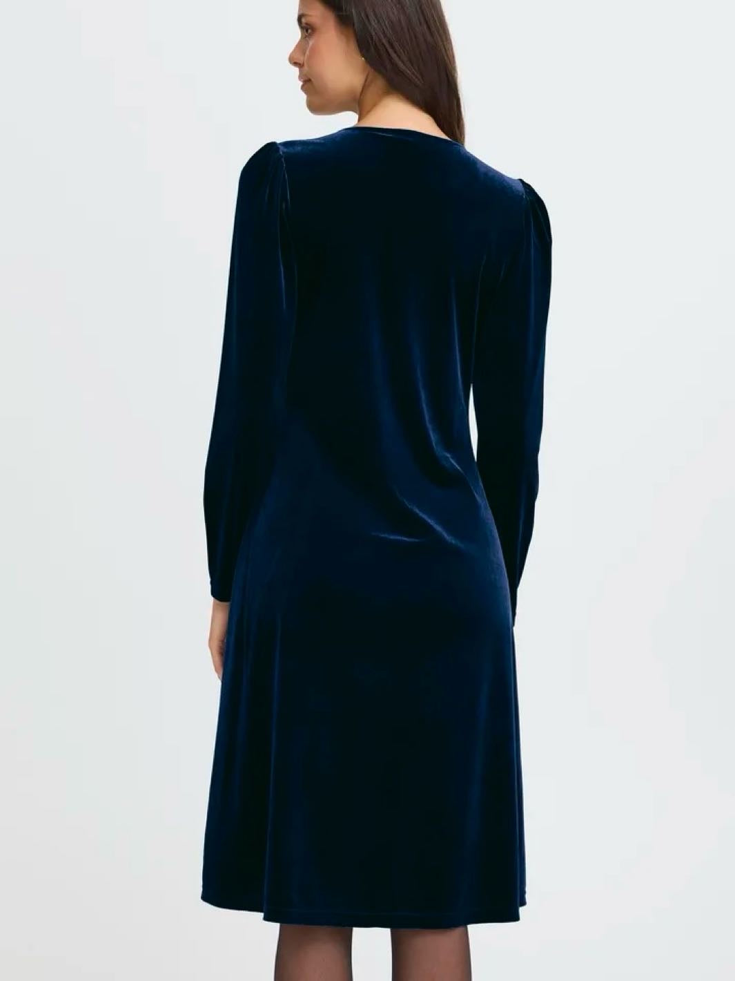 Lekker velourkjole med v-hals, draperinger over brystet og lange ermer. Kjolen har en a-fasong.