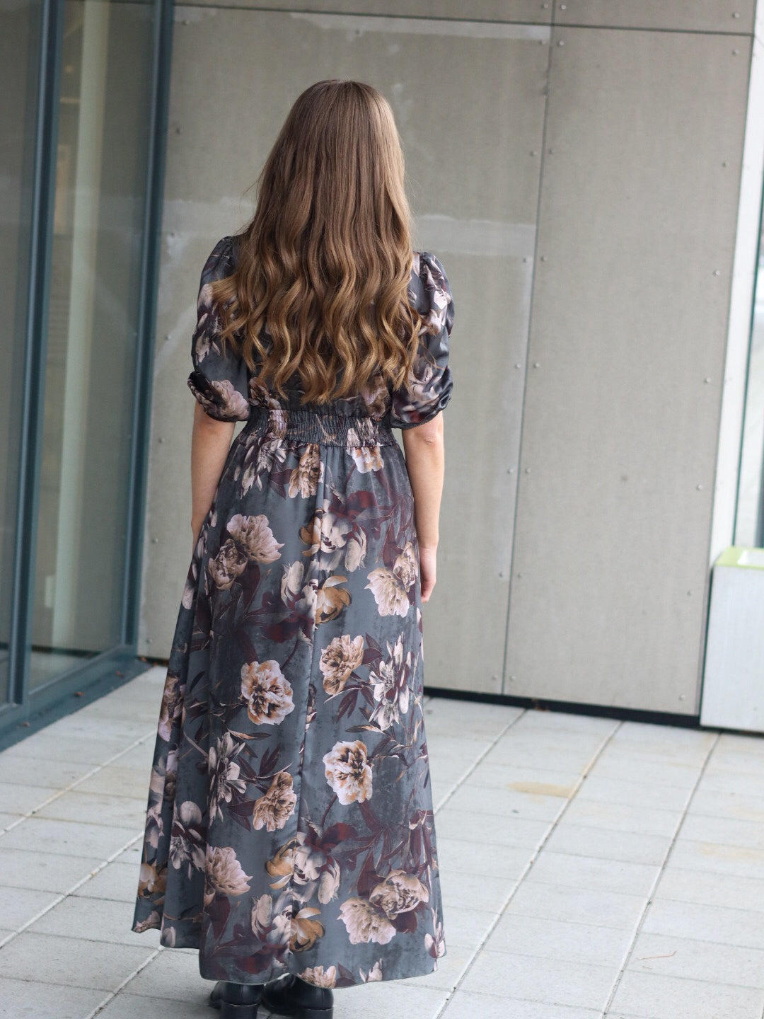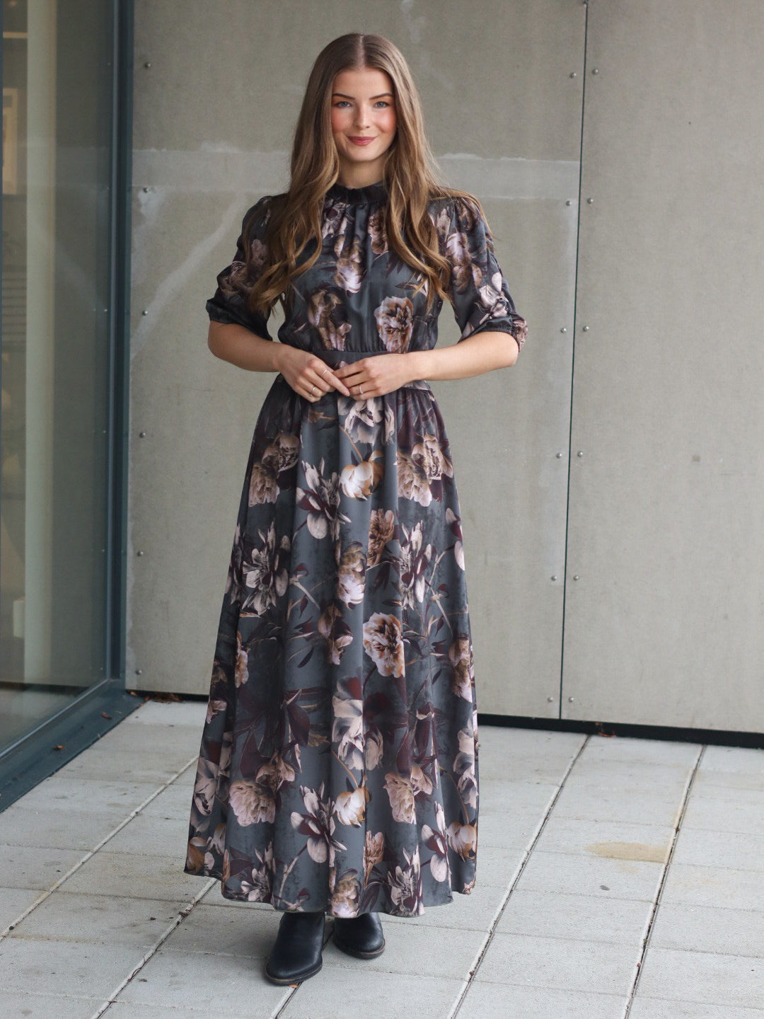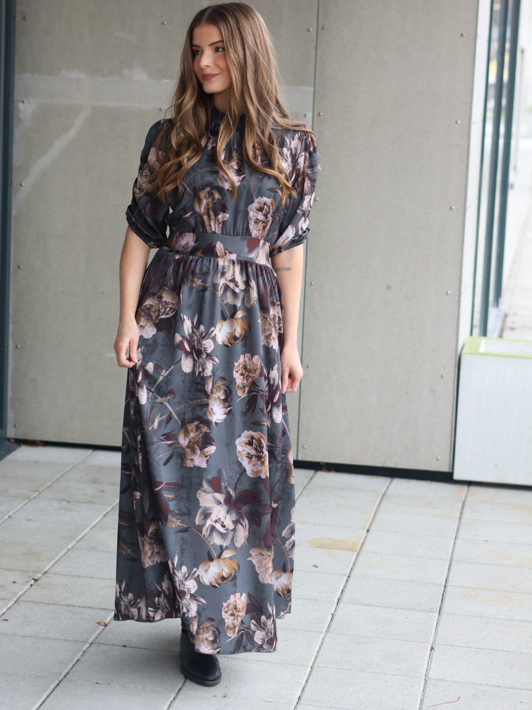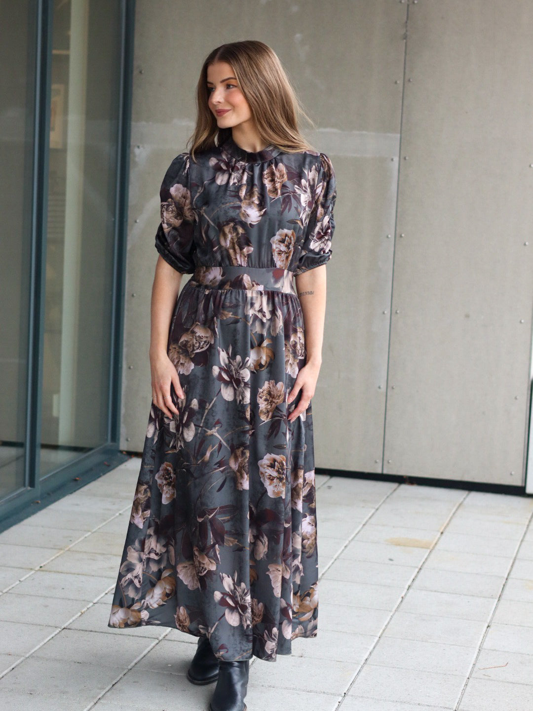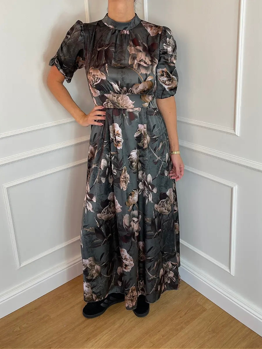 Super lekker maxikjole med korte puffermer, høy hals og strikk i midjen. Kjolen har et heldekkende mønster.